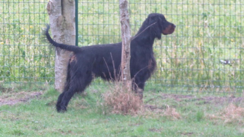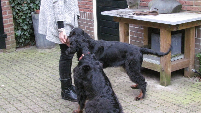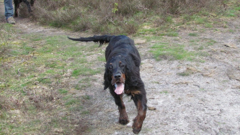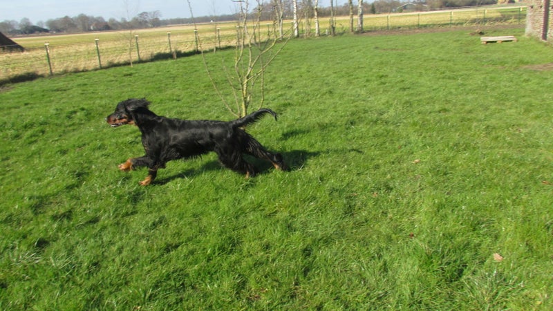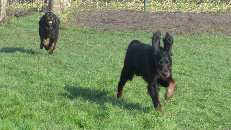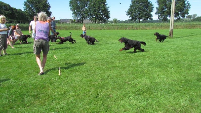 Het setter rennen, allemaal strak gespannen naar de baas kijken, die aan de overkant staat.