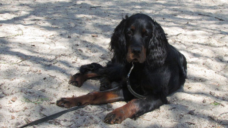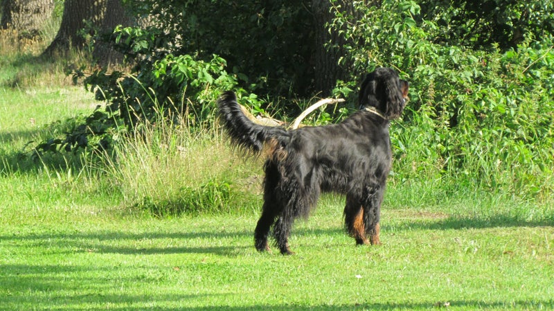 Abby snuffelt aan het stukje mos wat van de boom af viel