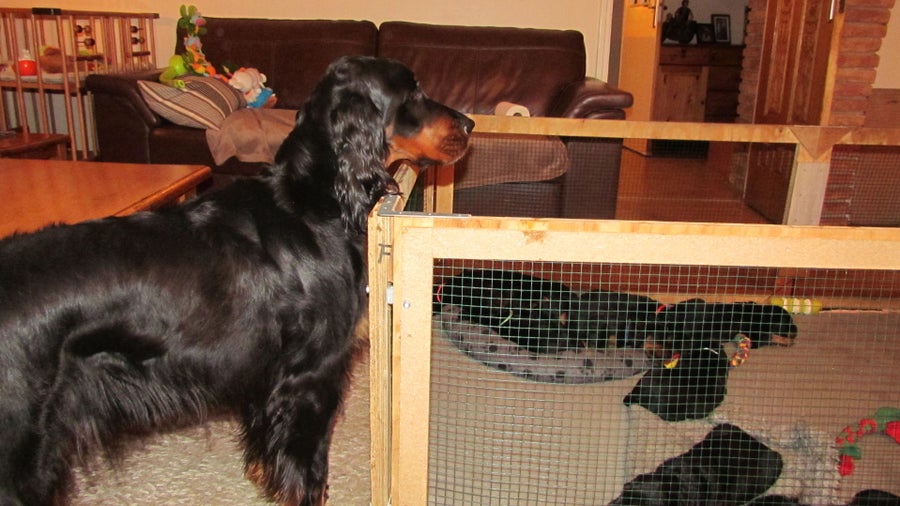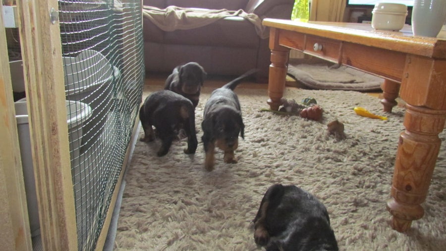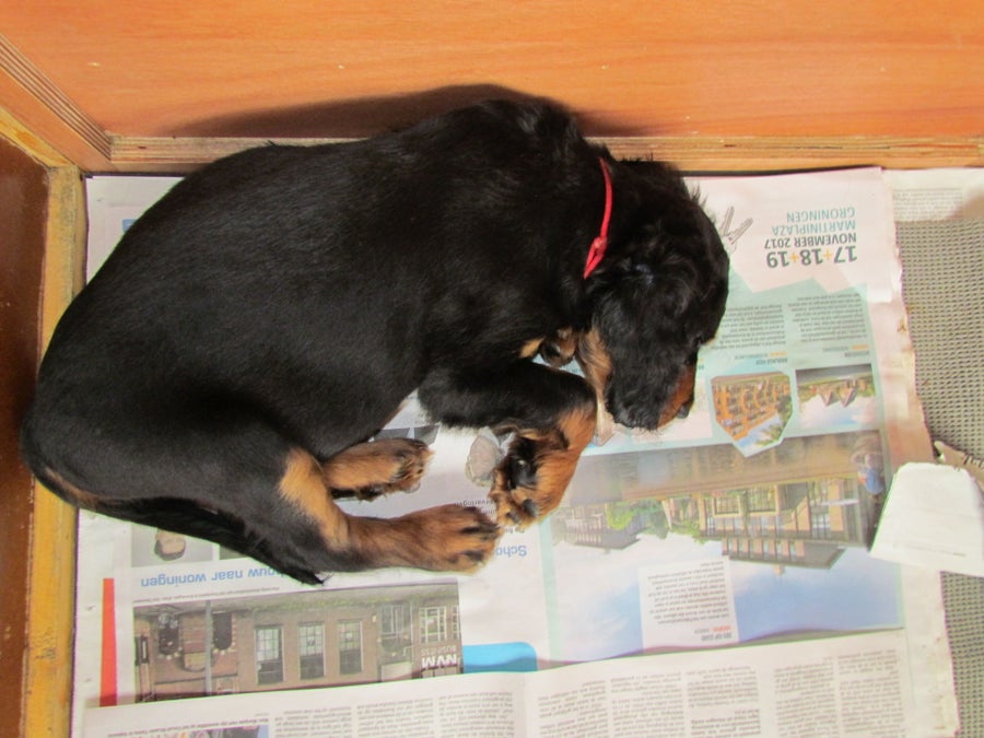 14/10/2017 De achterpoot op de plank, zodat er meer ruimte is voor de puppy's.