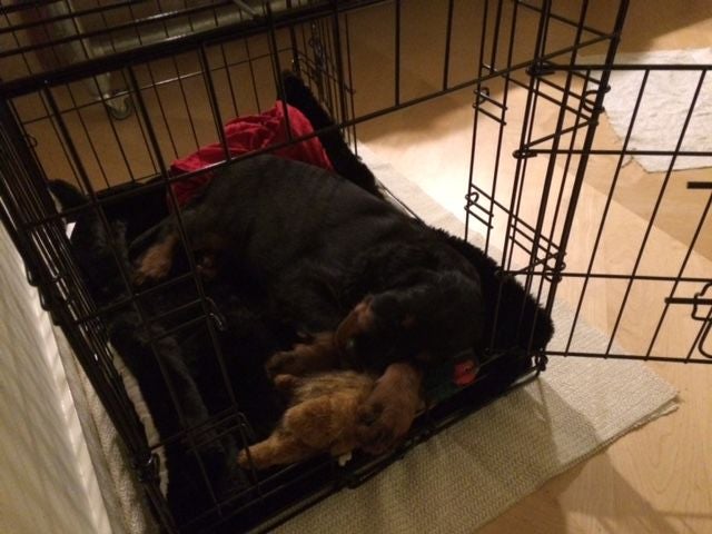 ee19-03-2016 Wij op bezoek bij Floor. Floor kijkt nieuwsgierig naar Caya.